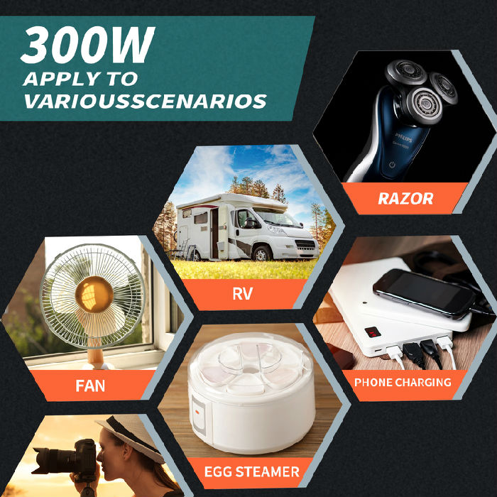 · 【high-quality features】 Modified sine wave Continuous 300W400W Power Inverter provides 600W 800W of peak power, and converts 12V DC battery power to 110V AC, with 3x AC outlets ,2x USB 2.4A ,1 USB-C 25W,PD 25W Fast Charging PortsAuto Fit quick charging ports,1x Cigarette lighter adapter.