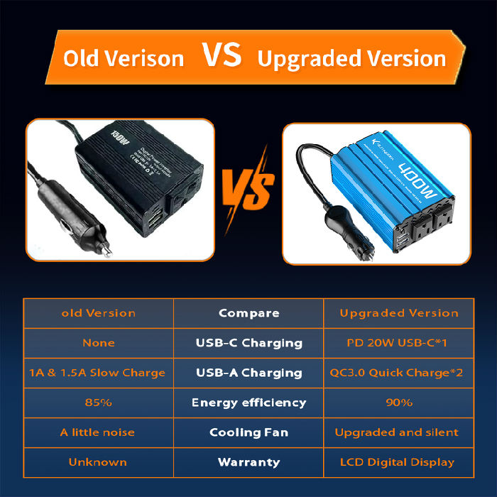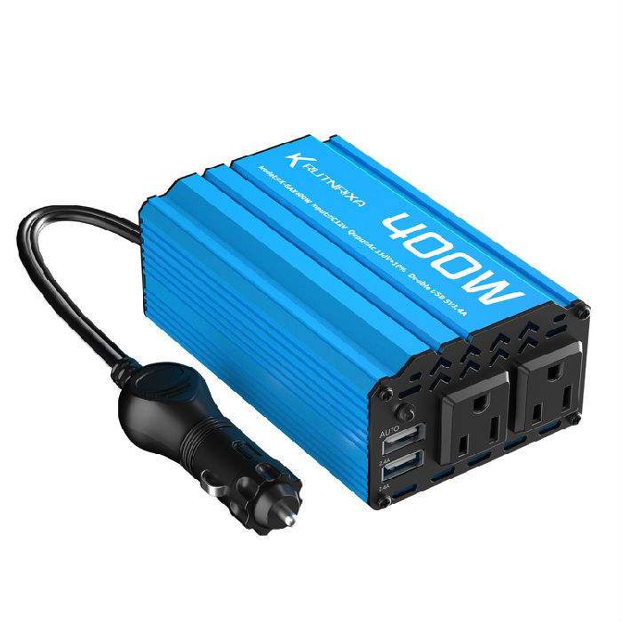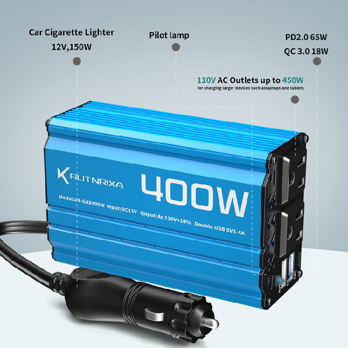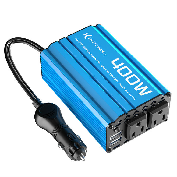 · 【high-quality features】 Modified sine wave Continuous 300W400W Power Inverter provides 600W 800W of peak power, and converts 12V DC battery power to 110V AC, with 3x AC outlets ,2x USB 2.4A ,1 USB-C 25W,PD 25W Fast Charging PortsAuto Fit quick charging ports,1x Cigarette lighter adapter.