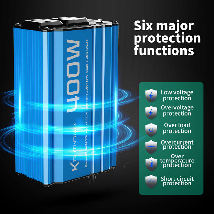 · 【Multiple-protection&LCD display shows】: 2 Built-in 40A fuses to protect your device. 6 kinds of protection to against: Overload / Short Circuit / Over heat / Reverse Polarity / Under or Over Voltage protections. The LCD display shows: input / output voltage, battery capacity, load capacity. Easy to know the battery status:full, normal or empty. Easy to know the loads capacity. Make your batteries and appliances safer.